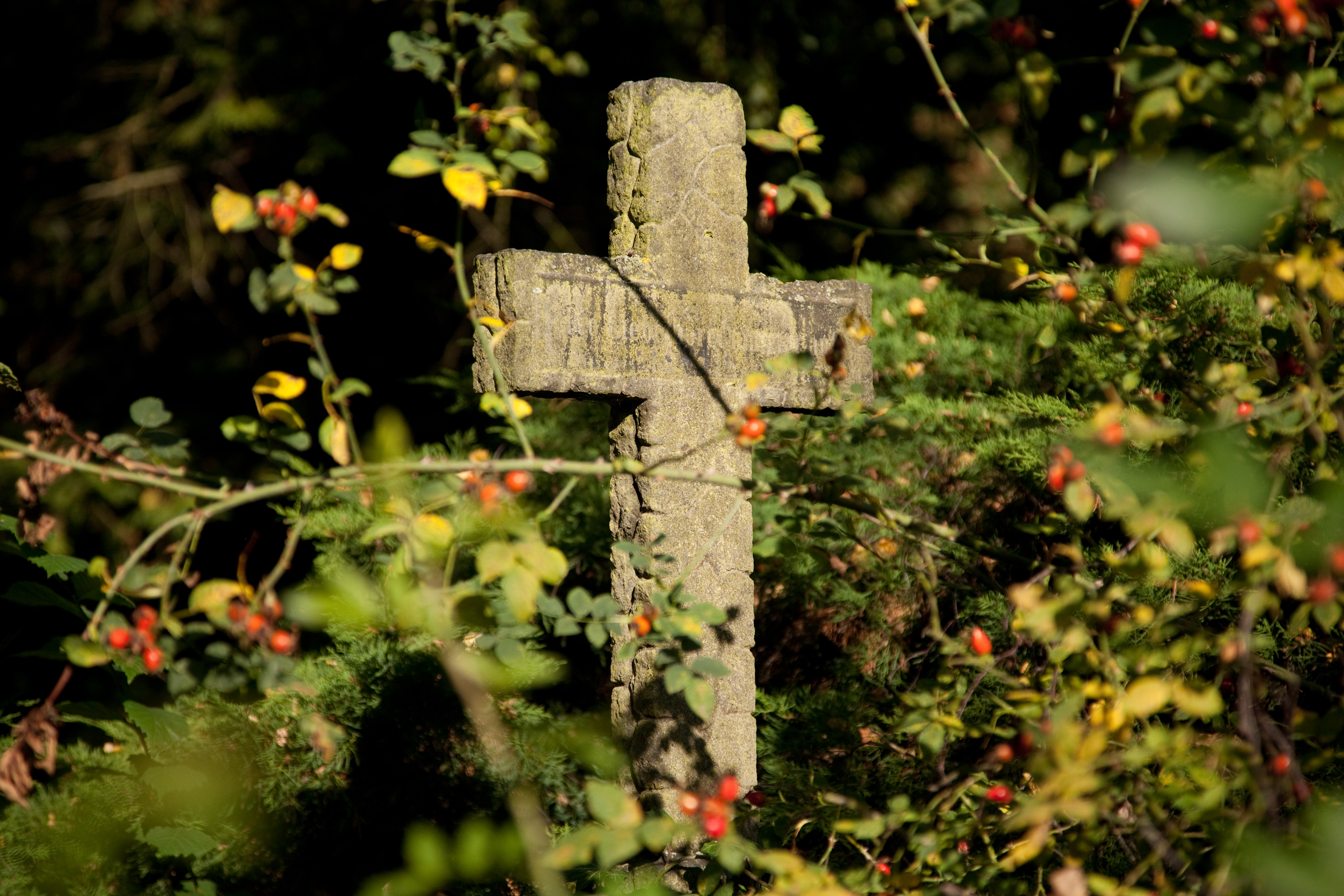 Ein altes verwittertes Steinkreuz zwischen Hagebuttenstraeuchern - Der im Jahr1843 eroeffnete Hauptfriedhof Kassels befindet sich im Stadtteil Nordholland. Mit Gruenanlagen mit viel Baumbestand und botanischen Besonderheiten bietet er Besuchern die Moeglichkeit zu Trauern und Abschied zu nehmen. Ueber den ganzen Friedhof verteilt gibt es Statuen und Skulpturen zu sehen. Der Friedhof gehoert dem evangelischen Stadtkirchenkreis an.