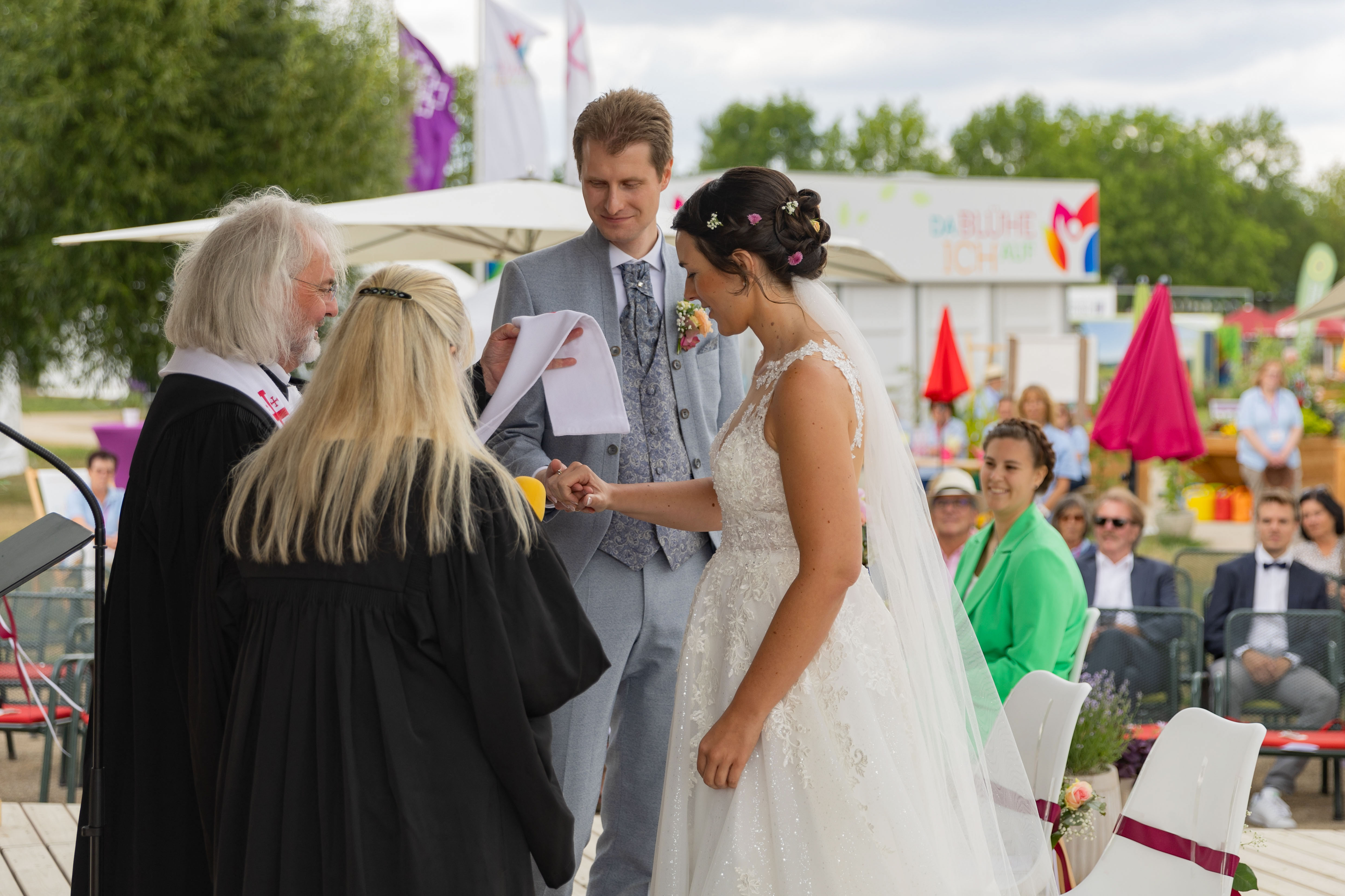 Das Hochzeitspaar Dr. Marie-Luise Reinhard und Maximilian Mika - Sie haben sich gegenseitig heute das Ja-Wort im Himmelszelt auf der Landesgartenschau gegeben: Dr. Marie-Luise Reinhard aus Fulda und Maximilian Mika aus Schmitten im Taunus. Das Paar hatte an der Verlosungsaktion der Evangelischen Kirche von Kurhessen-Waldeck (EKKW) teilgenommen und eine komplette Hochzeit am so genannten Himmelszelt gewonnen. Dort ist die evangelische Kirche noch bis zum 8. Oktober unter dem Motto „Da blühe ich auf“ präsent.