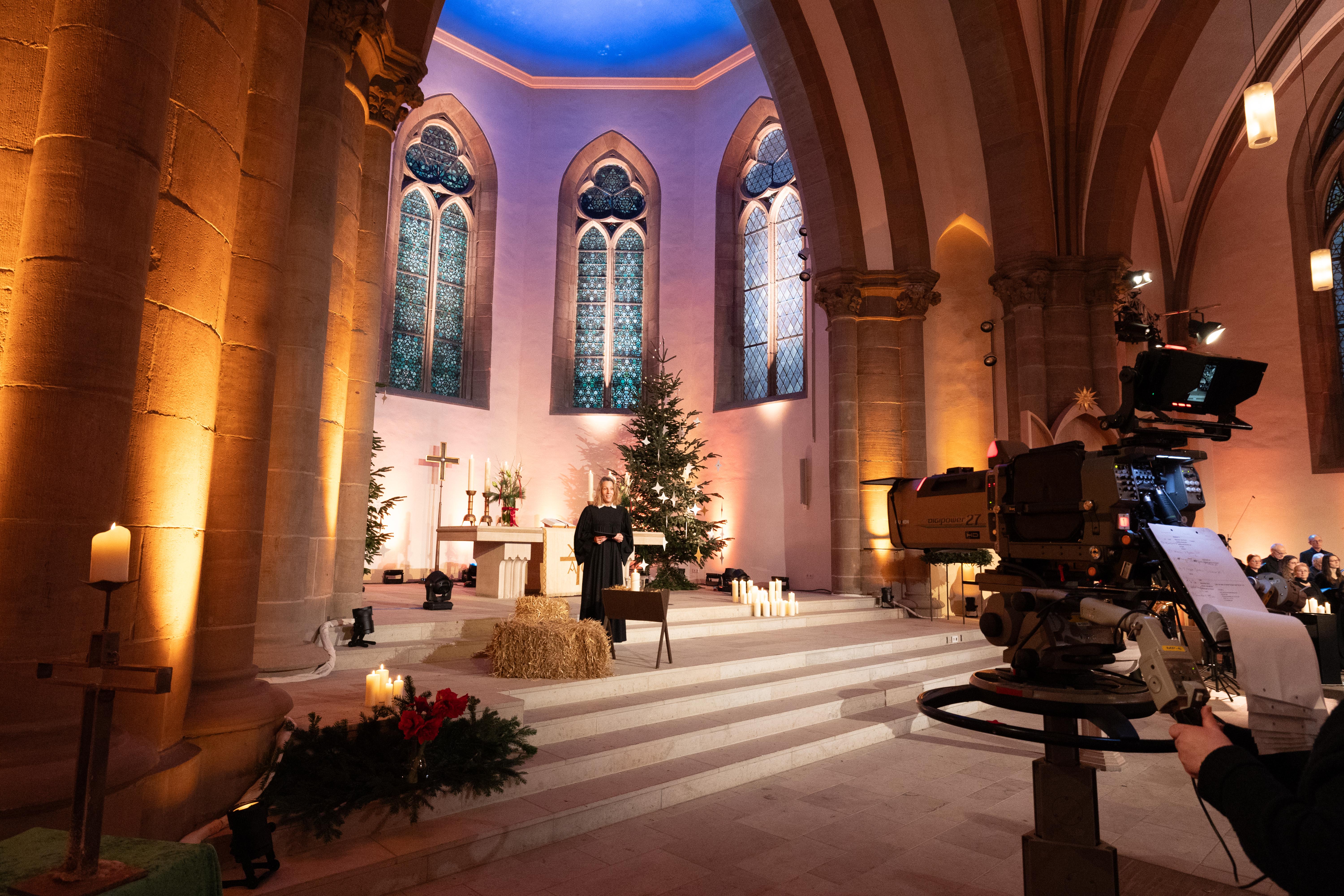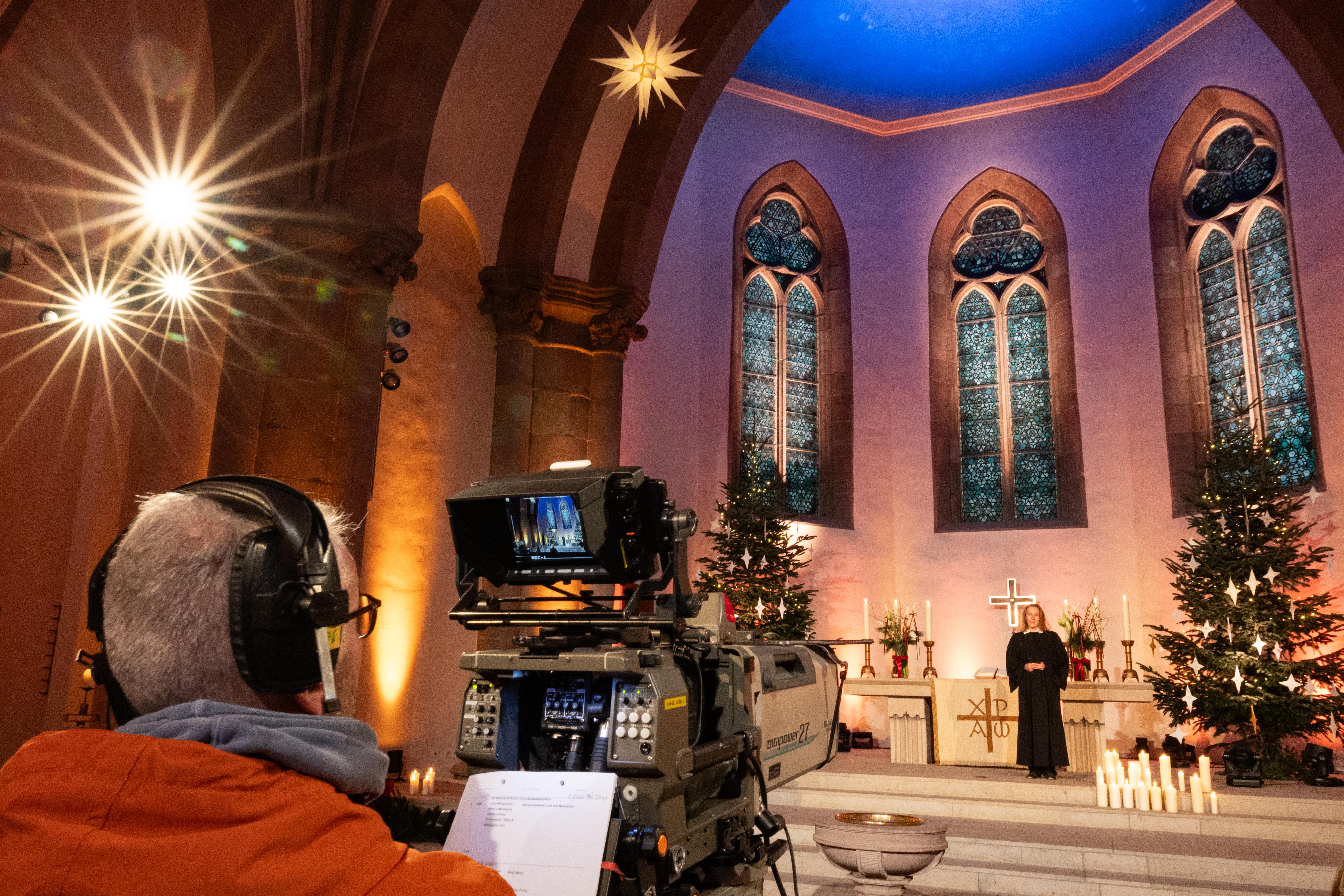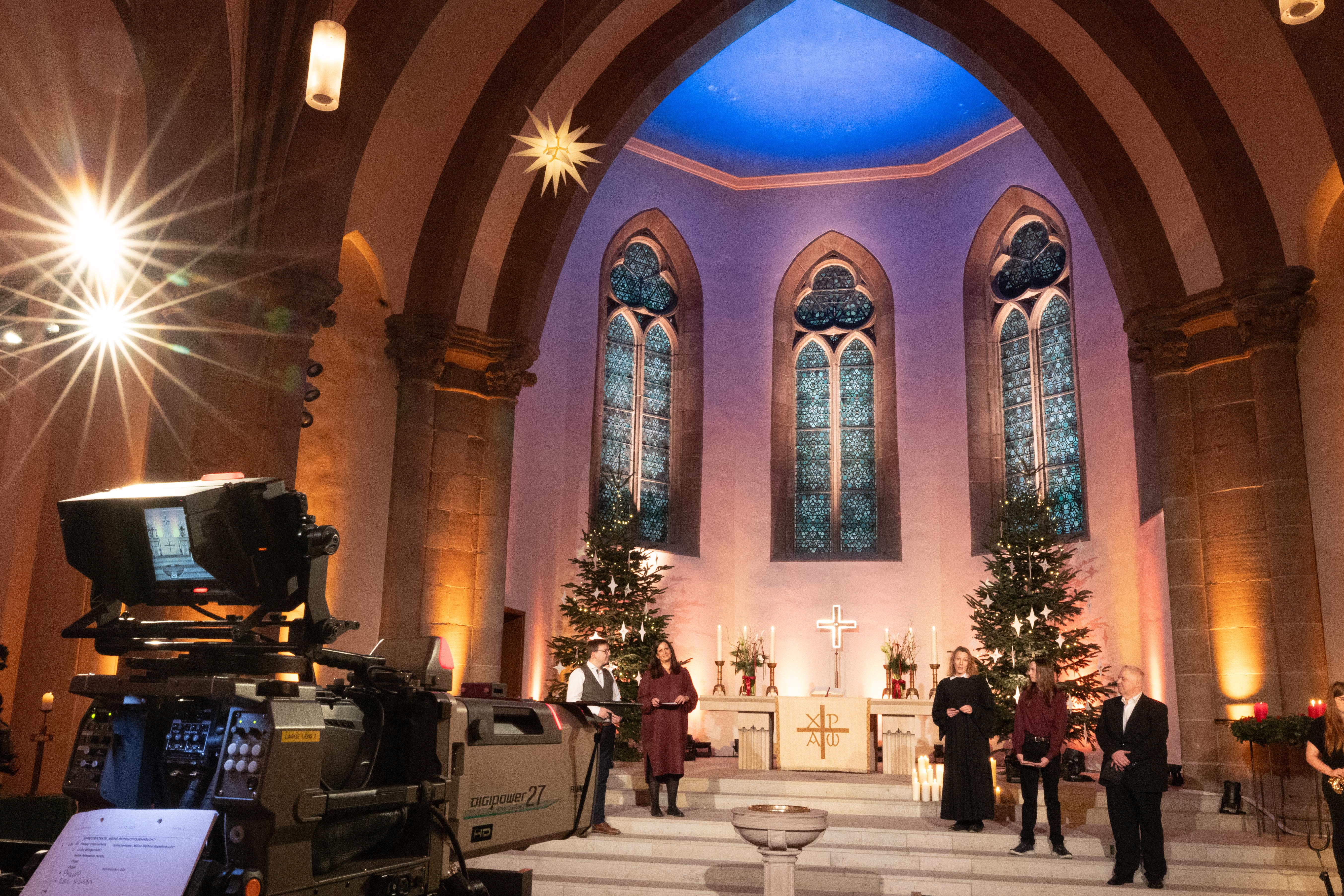 Die Christuskirche in Fulda - Generalprobe zum Evangelischen Heilig-Abend-Fernsehgottesdienst im ZDF mit Pfarrerin Jana Koch-Zeißig unter dem Motto: „Wonach suchst Du?“. Die Weihnachtsgeschichte wird gelesen vom Schauspieler und Theaterpädagogen Thomas Hof, für den weihnachtlichen Glanz sorgt ein Saxophonquintett. Es singt eine Auswahl des Kammerchores der Christuskirche Fulda unter der Leitung von Stefanie Muhl. Der Organist ist Bezirkskantor Tobias Wirth.